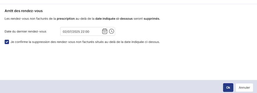 Il ne vous reste plus qu'à saisir la date, puis de cocher la confirmation de suppression des rendez vous au delà de la date indiquée.