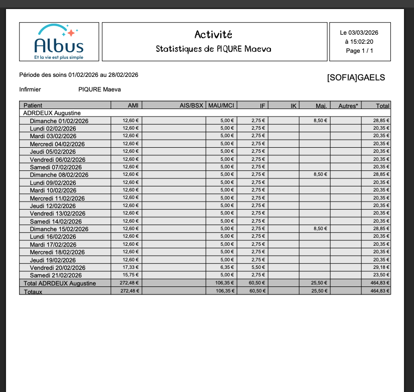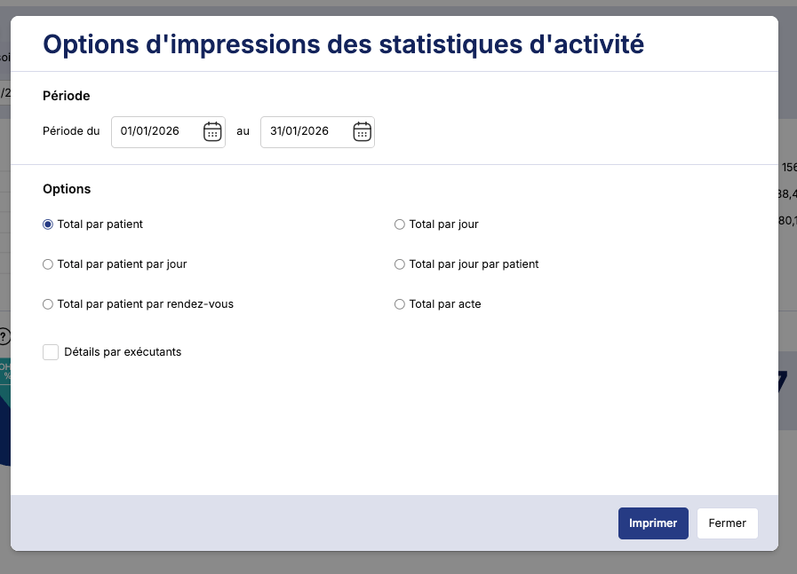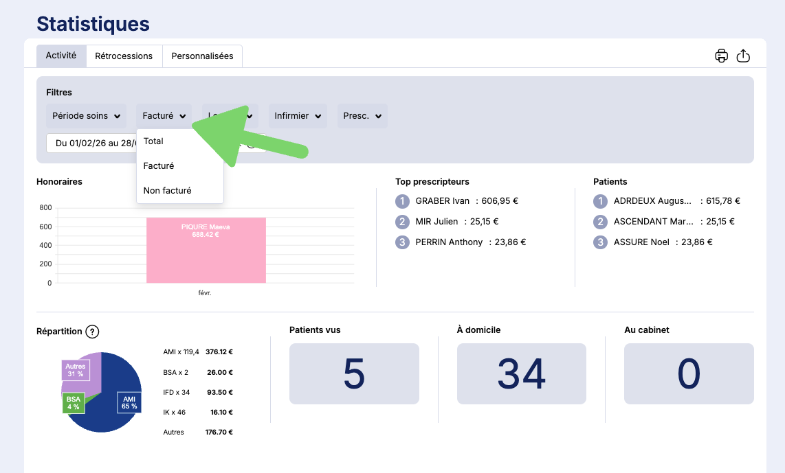 Une fois dans le menu, utilisez les filtres pour définir la période de soins que vous souhaitez analyser.