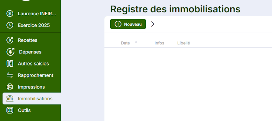 Vous pouvez créer une immobilisation depuis le menu Immobilisations du module Compta