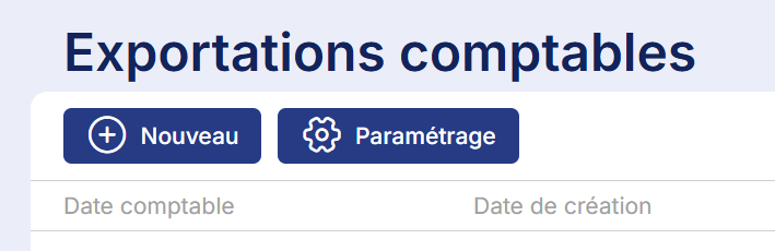 Une fois le paramétrage réalisé, depuis le menu Réglages > Paramétrages > Exportations comptables, cliquez sur le bouton Nouveau