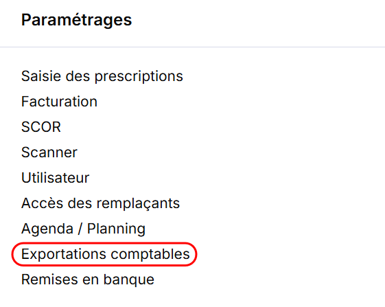 Ouvrez le menu Réglages > Paramétrages > Exportations comptables puis cliquez sur le bouton Paramétrage