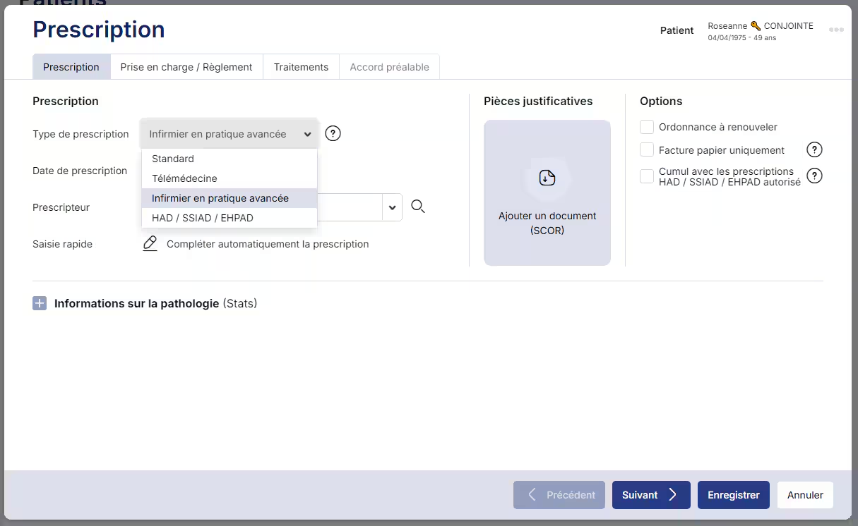 Pour facturer les forfaits, vous devez sélectionner le type de prescription Infirmier en pratique avancée.