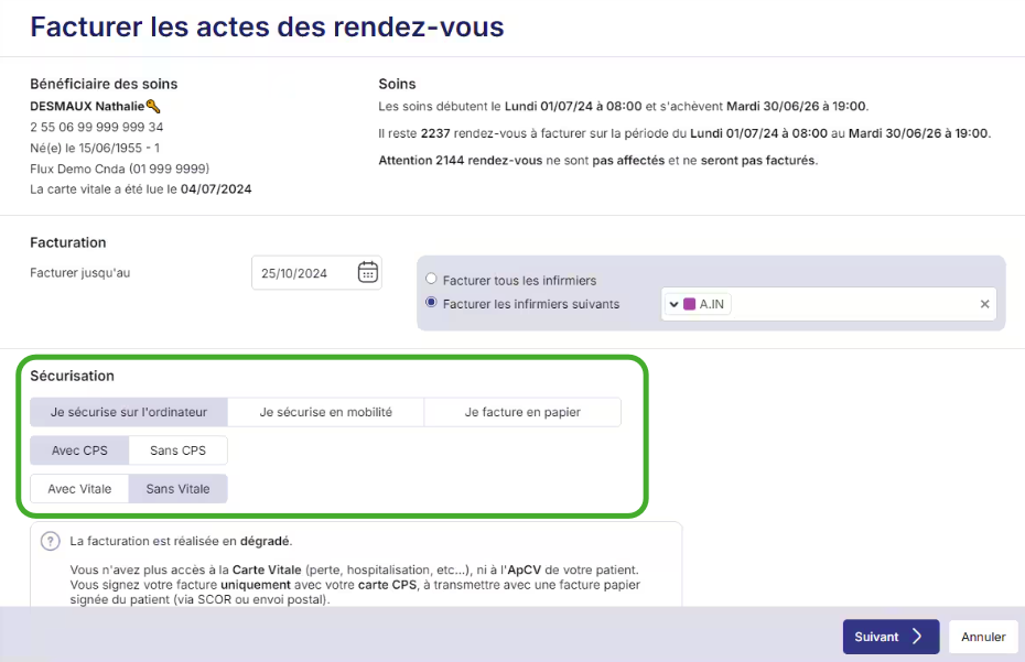Lancez la facturation, puis saisissez la date de facturation et les professionnels de santé concernés.