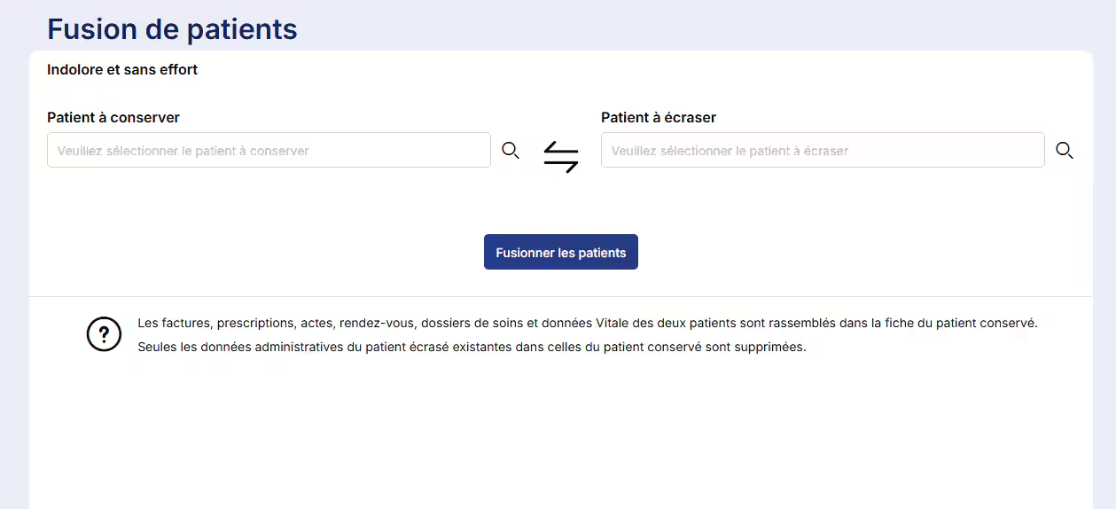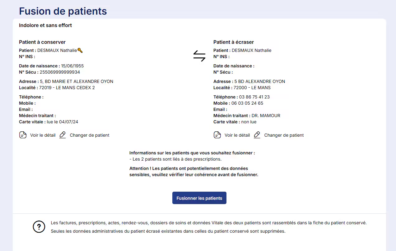 Cliquez sur le bouton Fusionner les patients. Et voilà, les patients sont fusionnés pour n'en former plus qu'un. Les factures, prescriptions, actes, rendez-vous et données vitales sont maintenant regroupés en lien avec une seule fiche patient, celle que vous aurez placée dans patient à conserver.