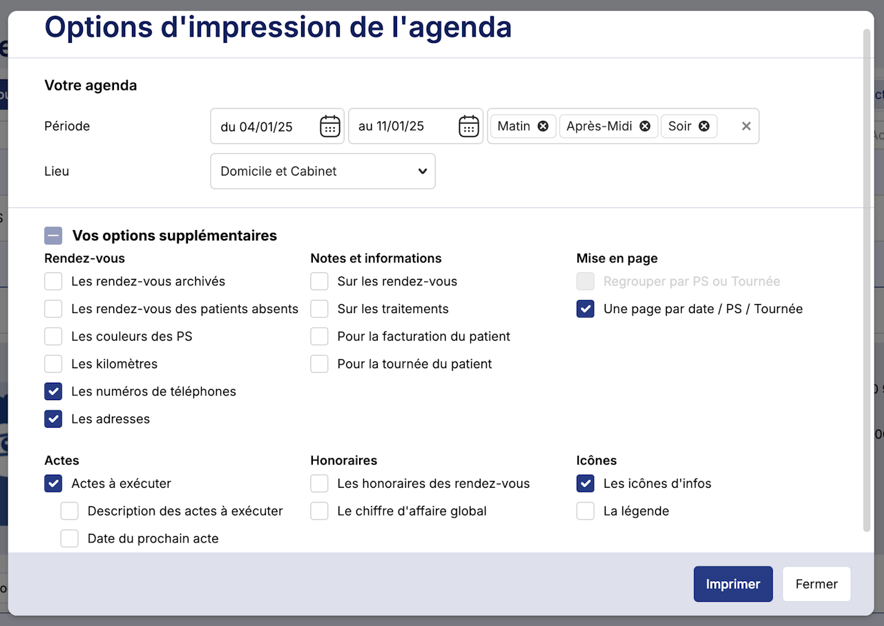 En haut à droite un bouton d'impression apparaît, cliquez dessus. Les options d'impressions apparaissent. Vous pouvez trier par période ainsi que le lieu des rendez-vous.