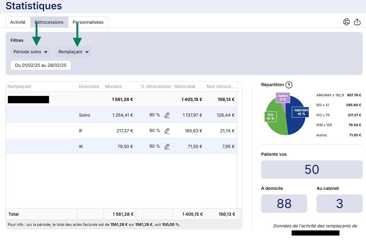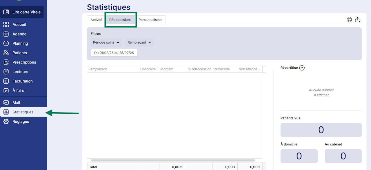 Pour vous y rendre, cliquez sur le menu Statistiques en bas à gauche de votre écran puis sur l'onglet Rétrocessions.