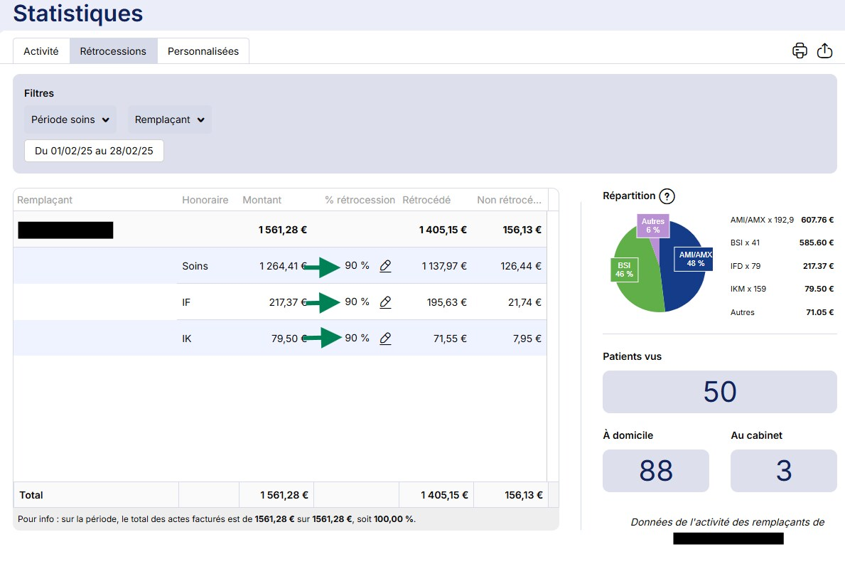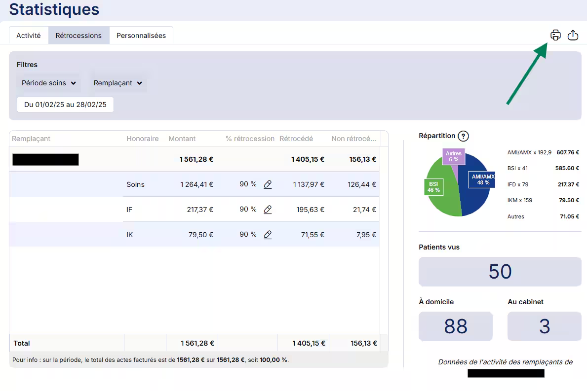 Des informations supplémentaires comme le nombre de patients vus, de passages à domicile ou de rendez-vous au cabinet sont accessibles à droite du tableau.