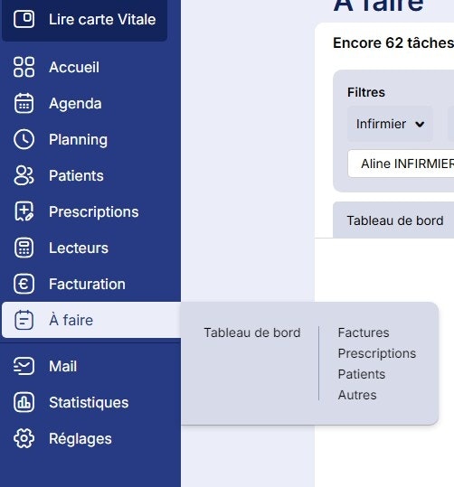 Le menu à faire vous permet de retrouver, en un clin d’œil, toutes les tâches encore en attente dans votre logiciel : ordonnances à numériser ou à renouveler, factures en attente de sécurisation ou de télétransmission, etc., le menu à faire est le menu idéal pour ne rien oublier.
