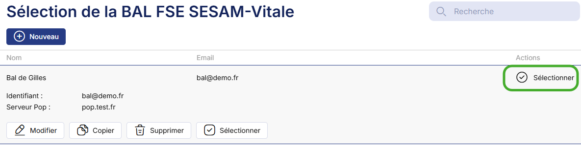 Si vous n’avez pas de Boite aux lettres paramétrée dans le logiciel, cliquez sur Sélectionner et choisissez la BAL précédemment créée.