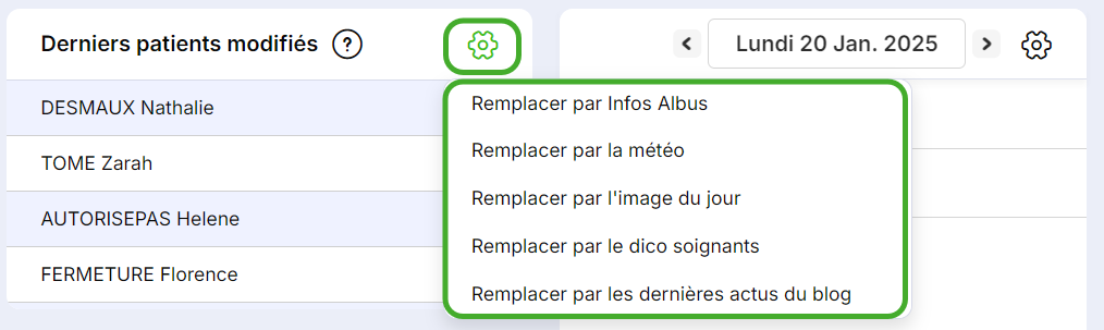 Les tuiles de la page d'accueil peuvent être personnalisées pour vous aider à être plus rapide et efficace dans votre travail. Pour ce faire, cliquez sur les roues crantées. Vous pouvez ajouter des raccourcis pour créer une facture, créer un patient ou lire une CPS à vous de choisir ce qui vous convient le mieux.
