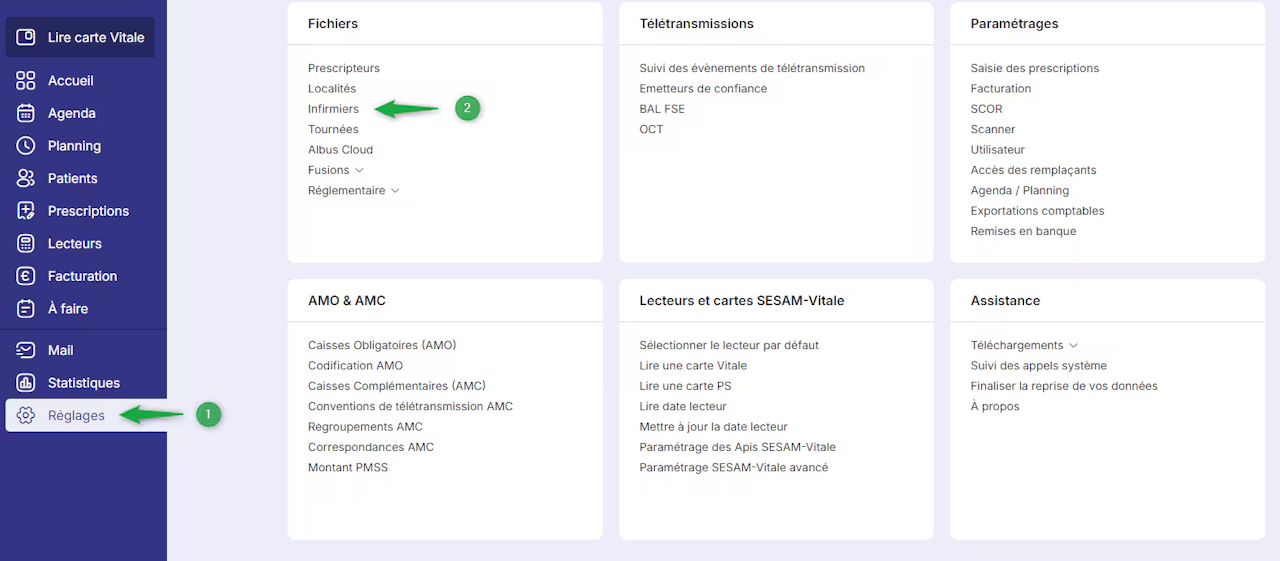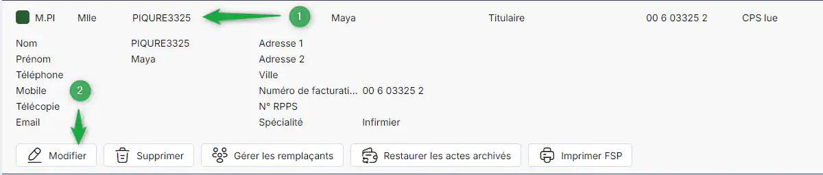 Rendez-vous dans le menu réglages puis Infirmiers dans le cadre Fichiers puis sélectionnez la fiche pour laquelle vous voulez ajouter une signature et cliquez sur Modifier.