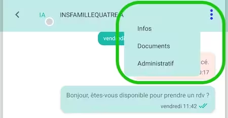 Une fois connecté, la conversation concernant votre patient est créé. Vous allez pouvoir accéder aux options de la conversation situées en haut à droite et qui vont vous permettre à la fois de compléter la fiche et d'ajouter les participants à la téléconsultation. Pour ajouter un professionnel de santé, ouvrez le menu Infos.