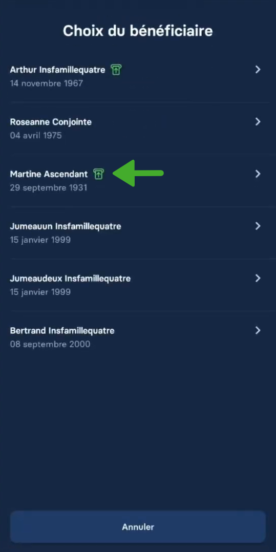 Une fois chez votre patient, lancez l'application Albus Air sur votre mobile, puis insérez la carte Vitale dans le lecteur. Le patient pour lequel des factures doivent être sécurisées via le mobile apparaît avec une icône verte de carte Vitale à droite de son nom. Sélectionnez ce patient.