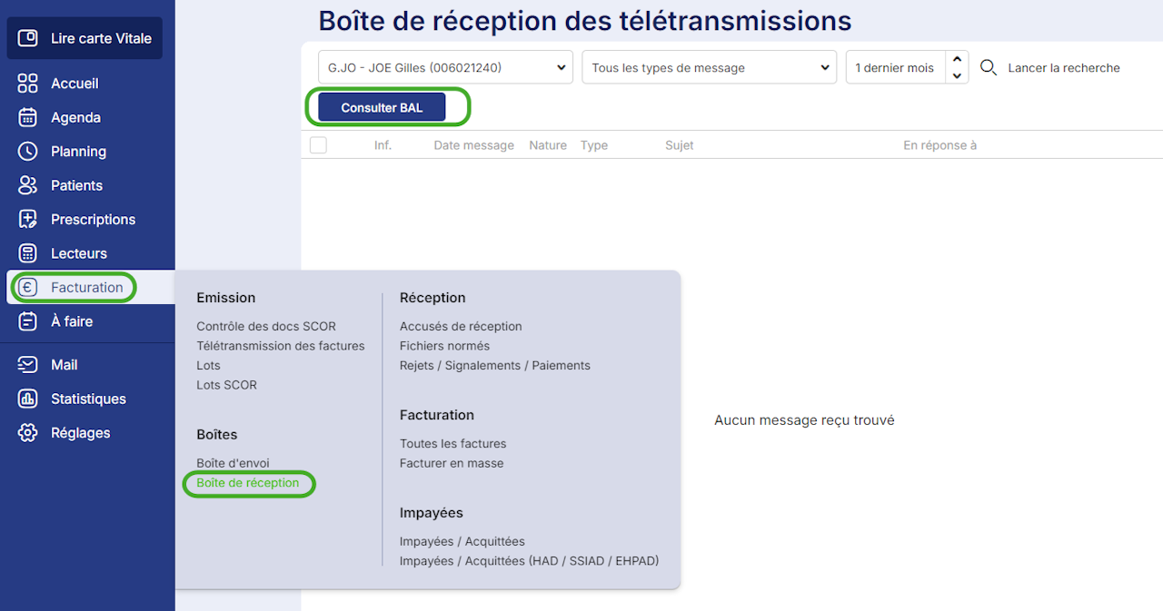 Un message d'avertissement apparaît alors : Messages non SESAM-vitale reçus.