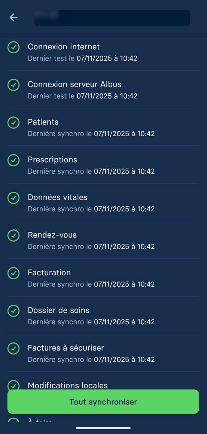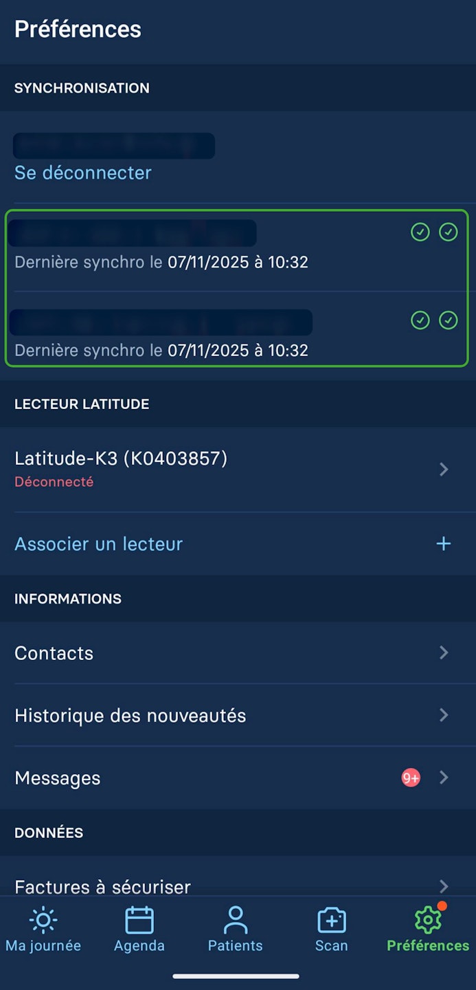 Pour synchroniser et mettre à jour les données de vos patients, leurs traitements, ou encore votre agenda entre l'ordinateur et l'application mobile, rendez-vous dans le menu Préférences depuis l'appli, puis sélectionnez votre cabinet.